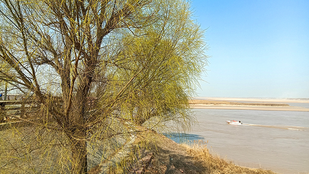 早春的陽(yáng)光鋪滿大地,黃河大堤已綻放新綠。